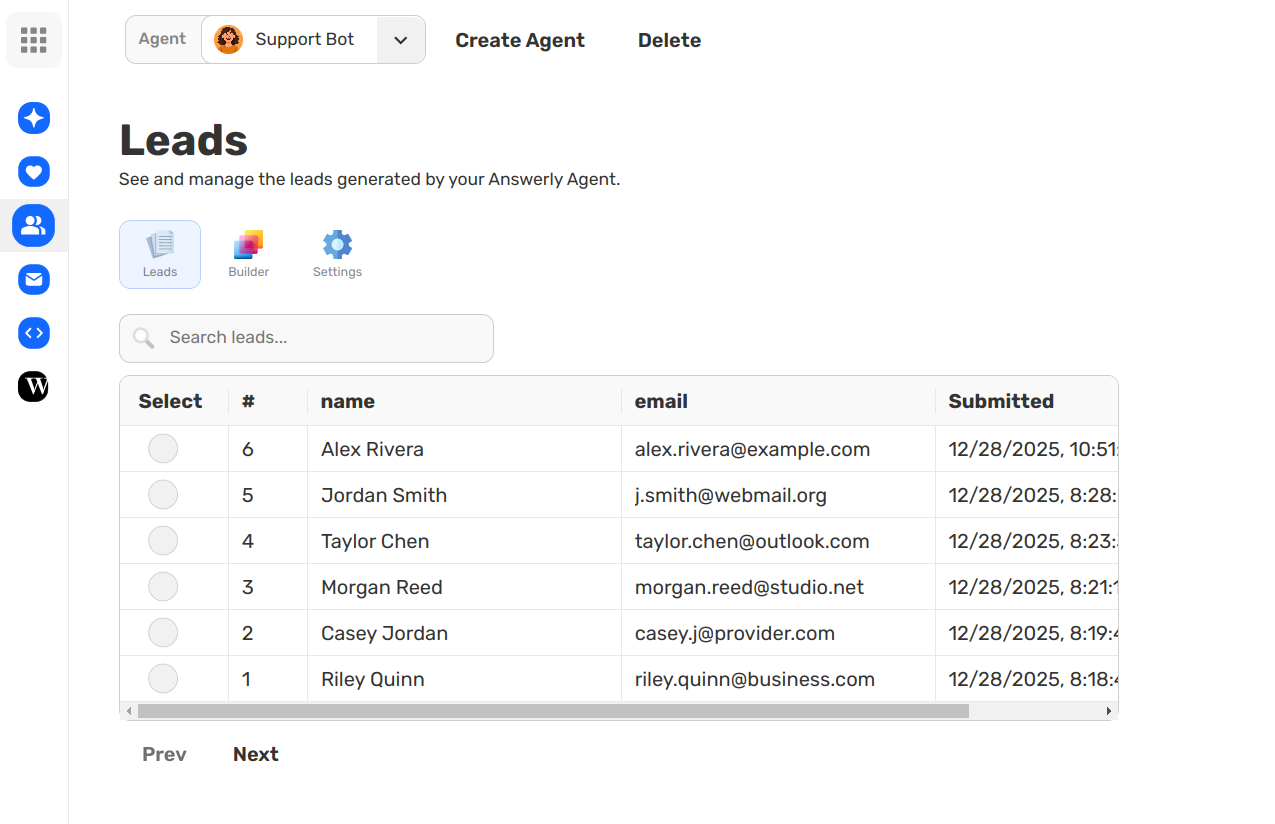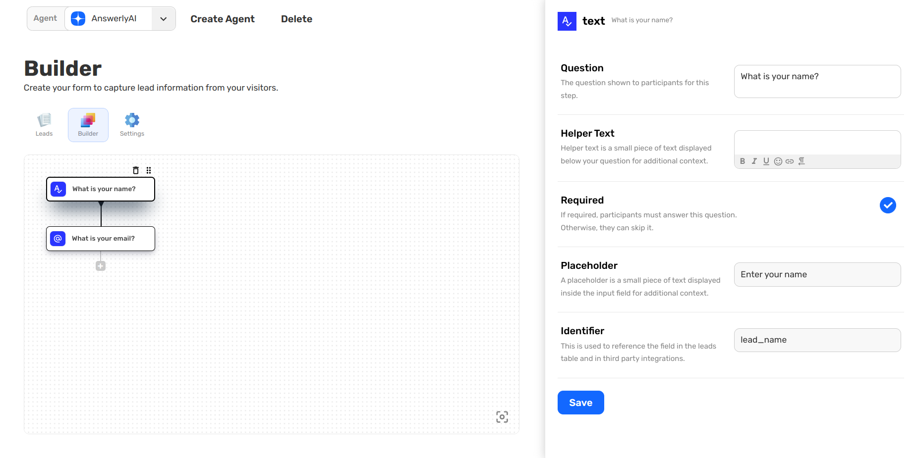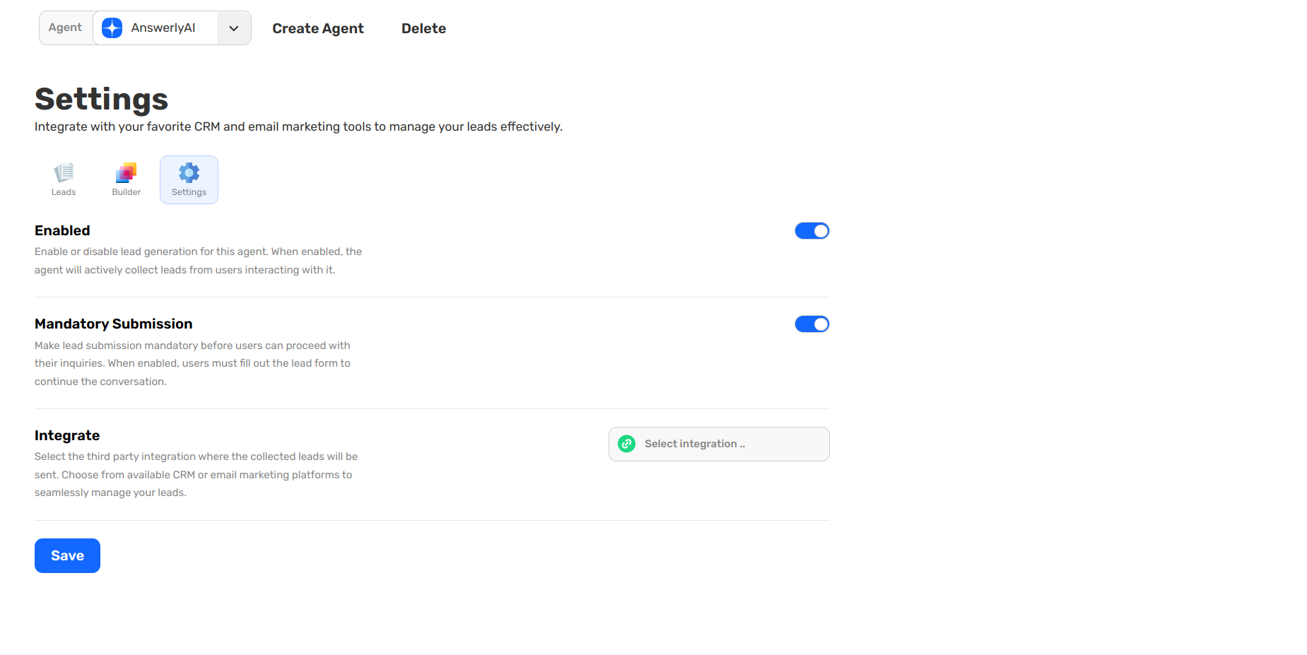 - Integrate: Connect Answerly to your CRM or email marketing tools to automatically sync every new lead your Agent captures.